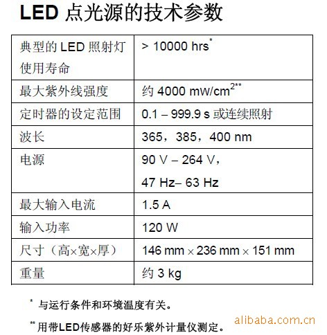 LED灯使用寿命超?0000小时?。可以按需要随时开启或关闭,无预热或冷却时间。灯头有4种不同的波长365/385/400 nm +/- 10 nm可选,使LED点光源的辐射光谱可以根据不同的应用情况转换、/p>