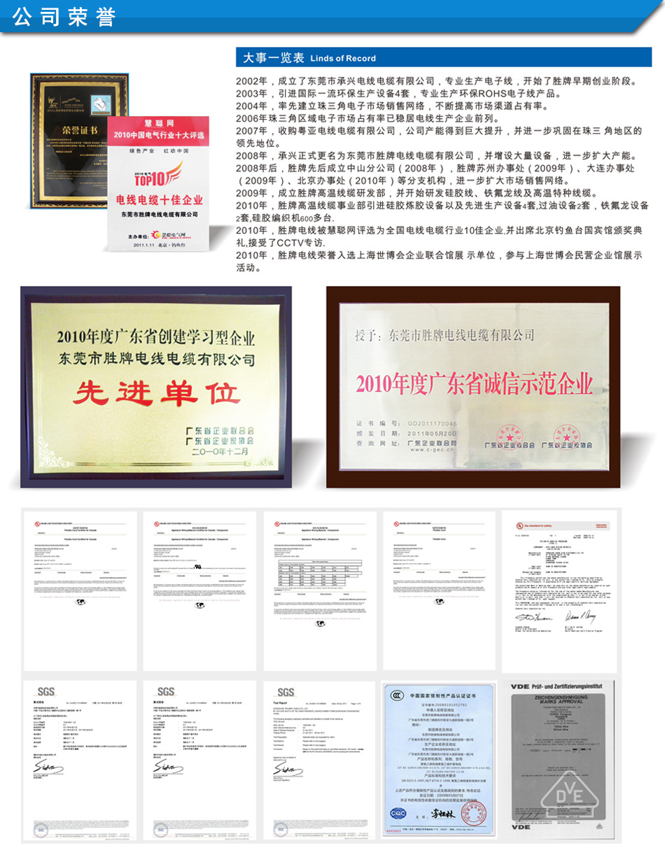 东莞市胜牌电线电缆有限公司,?010年上海世博会民营企业馆展示单位,是一家拥有开发、生产、加工、销售于一体的电线生产企业,主导产品为硅胶线、硅胶高压线、硅胶编织线、铁氟龙高温线、PVC电子线、电源线、屏蔽线以及特种线缆等等,拥有强大的研发和生产能力。总部位于东莞市虎门镇管理区,拥有企业员工?00人,年整体销售额超过3亿人民币、/span> 请认准我们的品牌编号'/span>E249743/E249745/E347603(/span>,真诚与您洽谈合作!本网站为东莞胜牌电线公司阿里巴巴旗舰罐/span>+/span>厂家直销价格绝对优惠+/span>质量有保证.我公司现有的客户包括9/span>长城电源、超威电源、贝奥斯PLC(汽车防盗系统)、三星电子、光宝电子等、/span> |