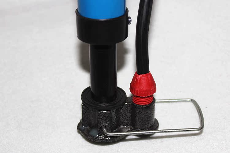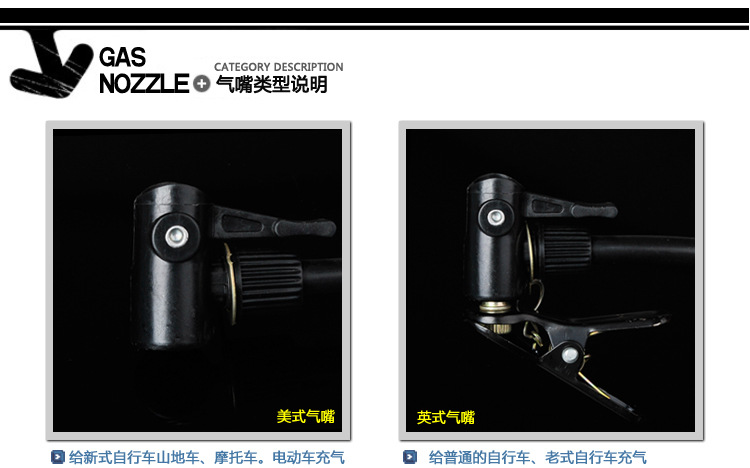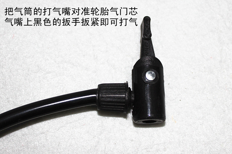 使用方法:把气筒的打气嘴对准轮胎气门芯,气嘴上白色的扳手扳紧即可打气
