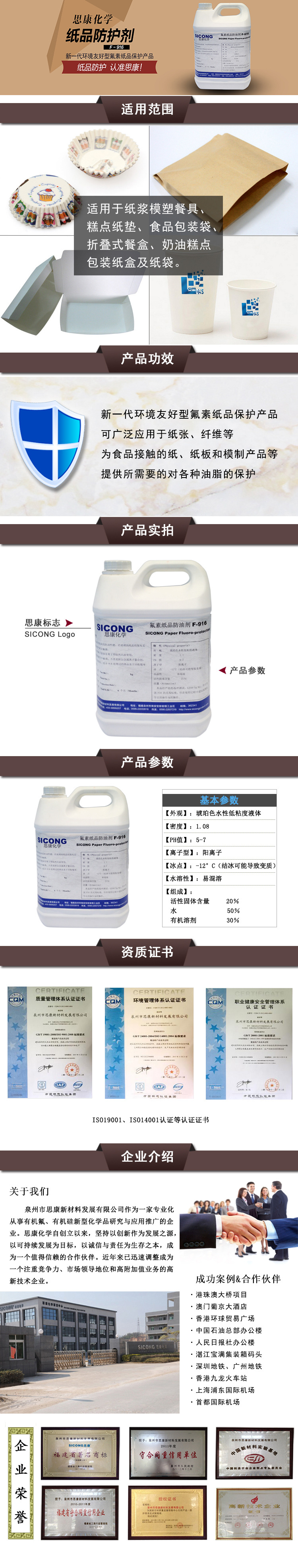 氟素纸品防油剁br>SICONG F-916 是我司开发的新一代环保型C6的纸品防油剂,产品不 PFOA 及其