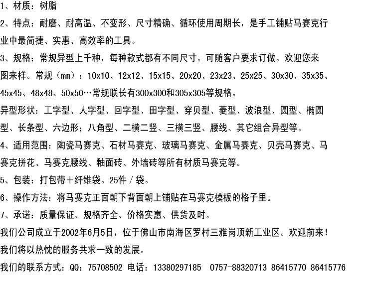 模板种类多样,包括金属马赛克模板,陶瓷模板,玻璃马赛克模板,石材马赛克模板,贝壳马赛克模板,规格多样,各类齐全、/span>