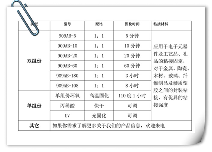 胶粘剂应用于电子元器件及工艺品、礼品的粘接固定,对于金属、陶瓷、木材、玻璃、纤维制品及硬质塑胶之间的封装粘接,有优异的粘接强度 |