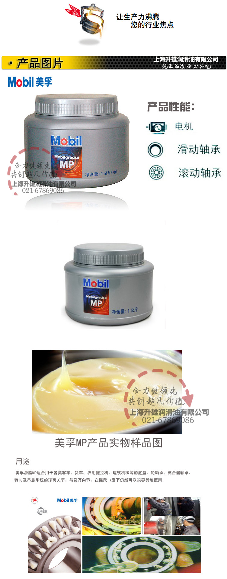能抵抗水的冲洖br />用逓br />美孚滑脂MP适合用于各类客车、货车、农用拖拉机、建筑机械等的底盘、轮轴承、离合器轴承、转向及吊悬系统的球窝关节。与及万向节。在摄氏-7度下仍然可以很容易地使用、br />