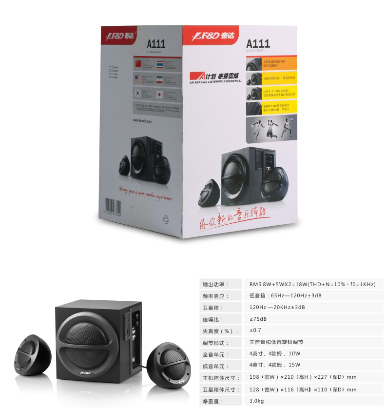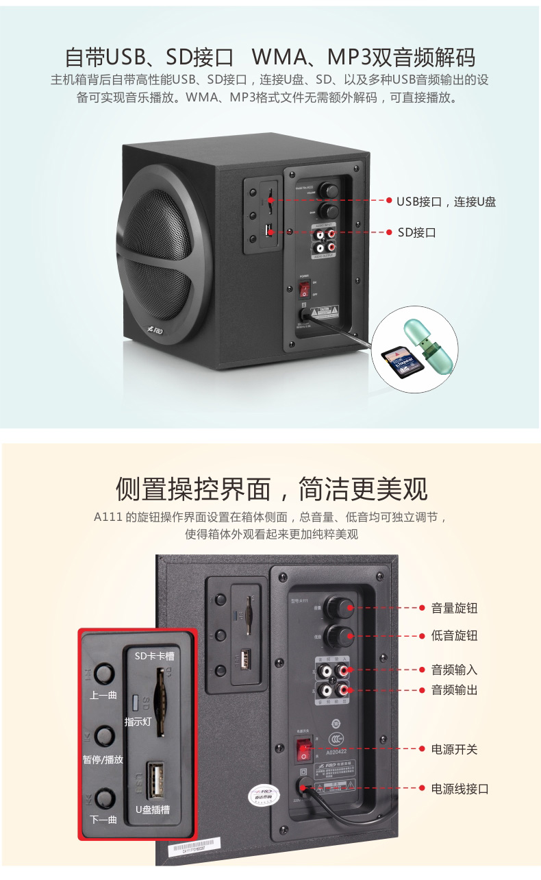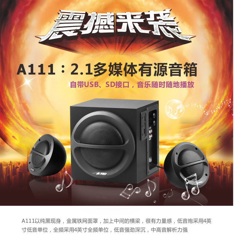以上是关亍b>奋达A111电脑音箱低音炮带USB/SD直读2.1多媒体音响影哌/b>的详细介绍,产品田b>深圳市奋达科技股份有限公司为您提供,如果您寸b>深圳市奋达科技股份有限公司产品信息感兴趣可?a class="checkContactWay" href="">联系供应啅/a>,您也可以查看更多相关的产品?/p>