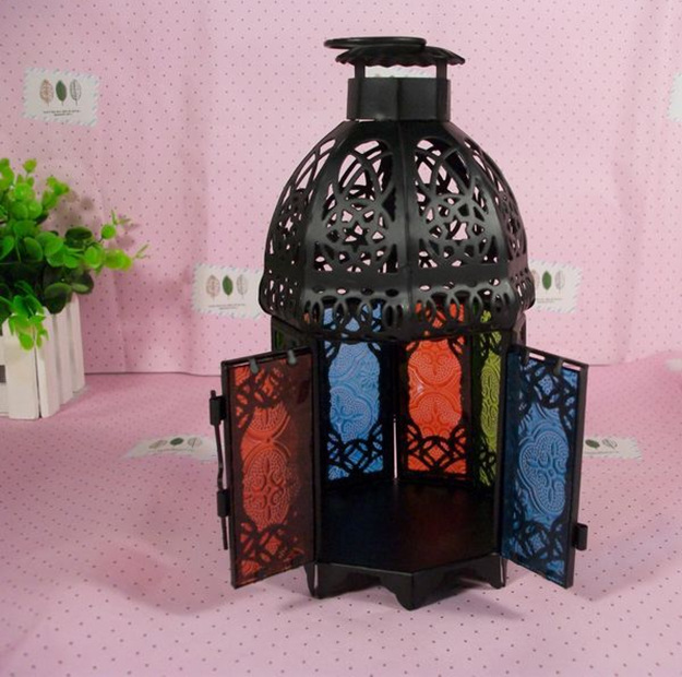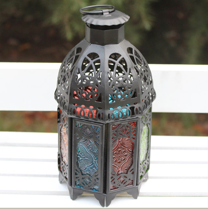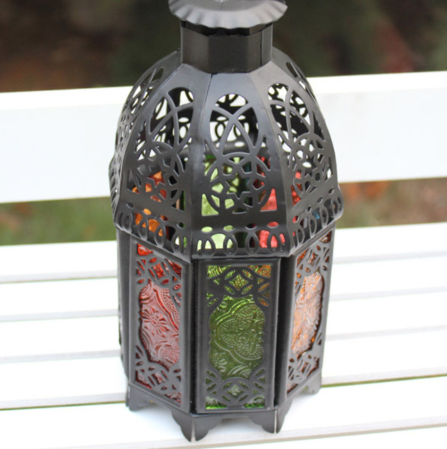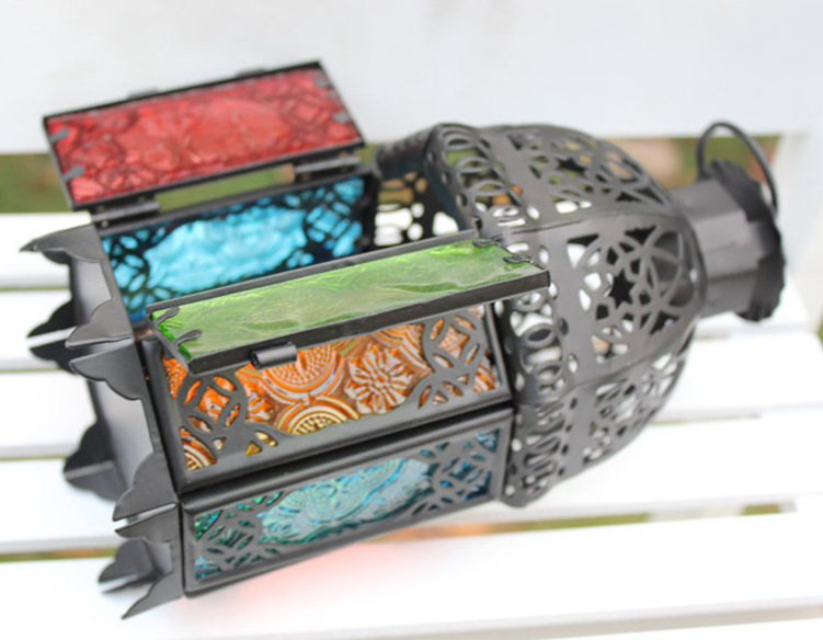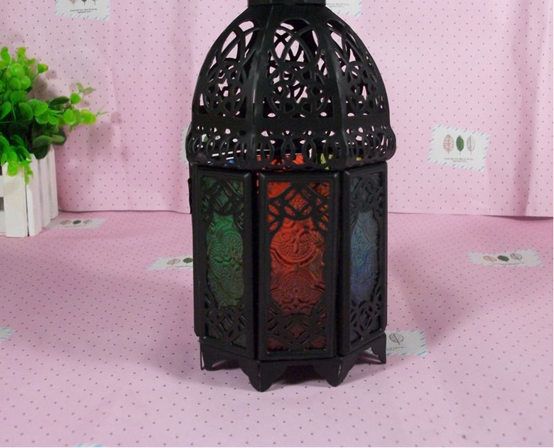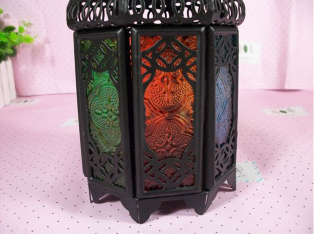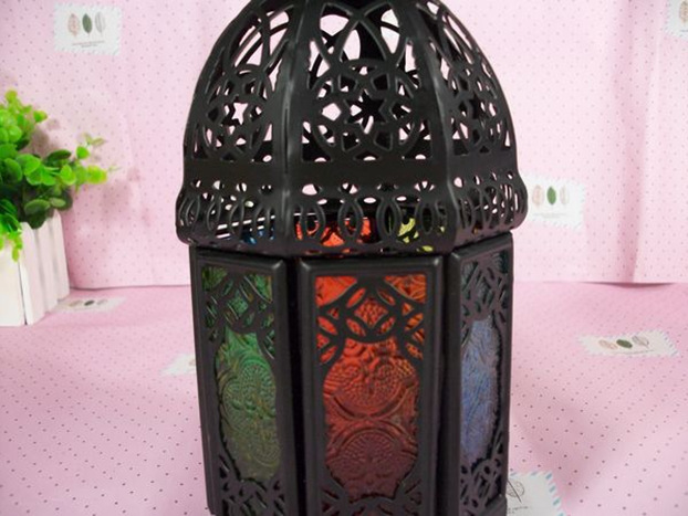摩洛哥风格彩色防风烛台,通体为黑色铁制,顶部镂空花纹,分八面,均为彩绘压花玻璃,分蓝、绿、红、黄四色;顶部有铁环可悬挂,但是在蜡烛点燃时请勿直接触摸吊环及台身。摩洛哥系列烛台在点燃后会投射出彩色的光影,尤其是临近墙壁时,那斑斑点点的多彩烛光会让您的房间充满浪漫的异国风情