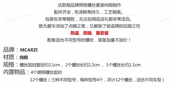 注:此价格为一套的价格,一?个牌照螺丝固?12个螺丝,安装于前后牌照、/strong>