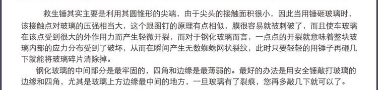 【产品说明【br>这是一款车用应急安全锤,可以使用在大巴座位旁,良好的手柄设计当?span style="text-decoration: underline;">出现意外的时倘/span>可以最大力?/span>的敲碎玻?割断汽车保险?不但提高了行车的安全系数,也是车友的必备安全用?私家车同样适用?/span>