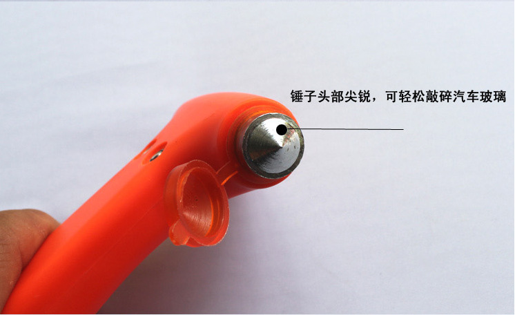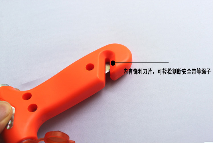 【产品功能【br>1、救生锤/安全锤:尖锐牢固的榔头,遇事故时打碎玻璃逃生、br>2、割刀:钩状内嵌式刀片,遇事故时割断安全带逃生、br>3、背后的平锤,可以做为榔头使用、/span>