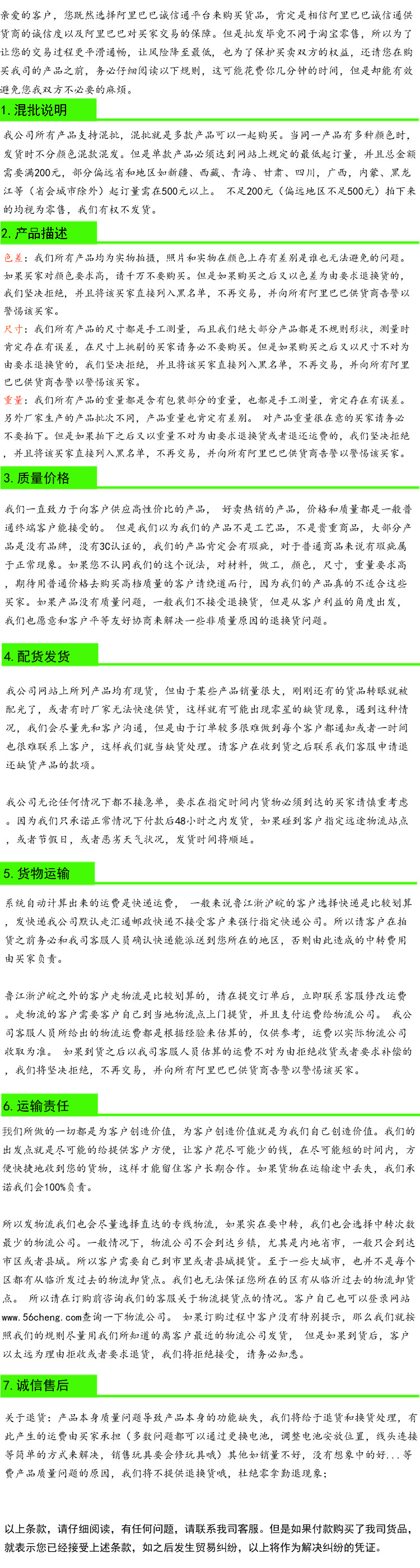 拍前必读:本公司发货默认快递为汇通、优速、天天,如需发其它快递请提前咨询我司客服,不接受任何备注快递。大件一律走物流,亲们最好是自己提供货运站,如无指定的物流的,我公司帮助查找和联系物流公司,关于运费我司客服会根据经验给亲提供参考值,不作为实际收费依据。实际运费根据货运站到货后实际收取为?请亲们悉知、/font>