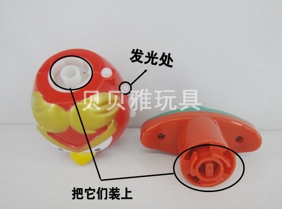 把发射器装上顺时针转几下,然后按下圆形突出部分,陀螺就旋转起来,七彩灯光非常漂亮!