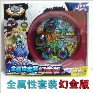 全属性套装包含四个幻金版/流金版的主角陀螺,攻击环为三种颜色幻彩,每个陀螺都用战神陀螺配件进行过改装升级,四种属性战斗力提升,配备了2个发射器?根齿条,包装内吸塑可用作迷你战斗盗/span>
