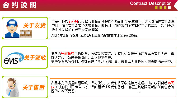 没有质量问题一律不接受退货。由于质量问题和运送途中出现了问题的商品请在三天内与我们联系,并提供照片为证。*换货的买家*需要负担换货的来回快递费?并且保证商品未使用,不影响再次出?拜托大家了、br>