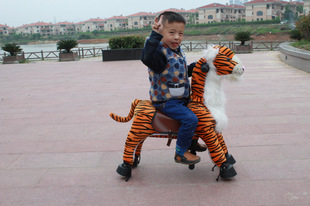 如下图所示(街拍): 图中为一?-6岁男孩在骑一只小老虎,对比孩子体形和小虎,正好合适一人骑乘,因为在设计之初我们的目的就是:孩子和马的身高 对等 大人和真马比例,能让孩子一 轻松驾驭,玩耍,像自行车那样便于掌控,而不用家长时时担心操控不了!