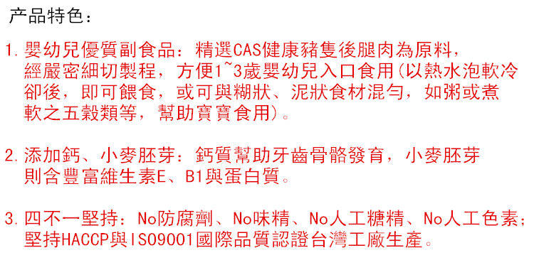 【保质期】一平br />【产 地】台湽br />【成 份】精选猪肉、砂糖、豆粉、酱油、猪油、小麦胚芽、食盐、磷酸二钙、调味料